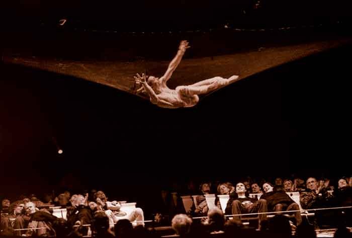 Το γεγονός ότι οι θεατές (περίπου 800 άτομα σε κάθε παράσταση) κάθονται σε καρέκλες με κλίση προς τα πίσω ώστε να βλέπουν τον ουρανό του θόλου αποτελεί μια πανέξυπνη ιδέα που εξασφαλίζει άνεση στο θεατή και του δίνει τη δυνατότητα να απολαμβάνει στο έπακρο τα σκηνικά δρώμενα, αφού η σκηνή είναι ... ο ίδιος ο ουράνιος θόλος. Φιγούρες στο ημίφως αιωρούνται ψηλά στο διάστημα, κρεμασμένες από σχοινιά και ιμάντες προσαρμοσμένους σε υποστηρίγματα που μοιάζουν με γερανούς, σώματα βουτούν ξαφνικά στον αέρα πάνω από τα κεφάλια των θεατών ενώ οι ψιθυριστοί ύμνοι με συνοδεία κόντρα μπάσου παραπέμπουν σε φωνές από την αρχαιότητα που κουβεντιάζουν ανέμελα. Κι ενώ κάποια παιδιά αρχίζουν να αδημονούν, οι γερανοί φωτίζονται ξαφνικά σαν διαστημόπλοιο και περιστρέφονται απαλά προς τα επάνω, το προστατευτικό δίχτυ εμφανίζεται και οι ακροβάτες αναδύονται από το σκοτάδι, αποκτώντας εκτυφλωτική λάμψη στα εντυπωσιακά τους νούμερα.
